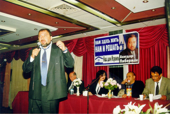 Авигдор Либерман – израильский клоун-фашист проводит рекламную кампанию в русском гетто в Хайфе. Для этих целей был снят какой-то ресторан в самой клоаке.