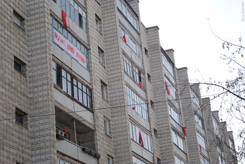 Побывал наконец на площади Труда в Новосибирске, где жители домов выбросили красные флаги протеста.